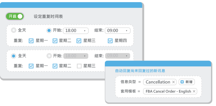 亚马逊研究表明,24小时内回复买家关于订单的问题,能够减少50%的差评。无论是周末或是法定节假日,只要提前设定好客户的问题类型,BQool卖家酷就能帮您轻松解决无法及时回复邮件的问题,大幅降低差评率!