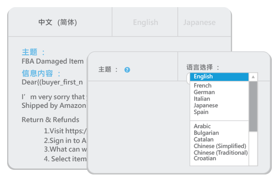 BQool卖家酷提供多种主题邮件模板,您可以根据不同情境选择不同的邮件模板来回复客户邮件,对于常碰到的客服问题也能够自定义模板并一键回复。另外,所有模板都支持一键翻译,一键将您的邮件翻译成各个国家的语言,让您不再为语言问题而烦恼!