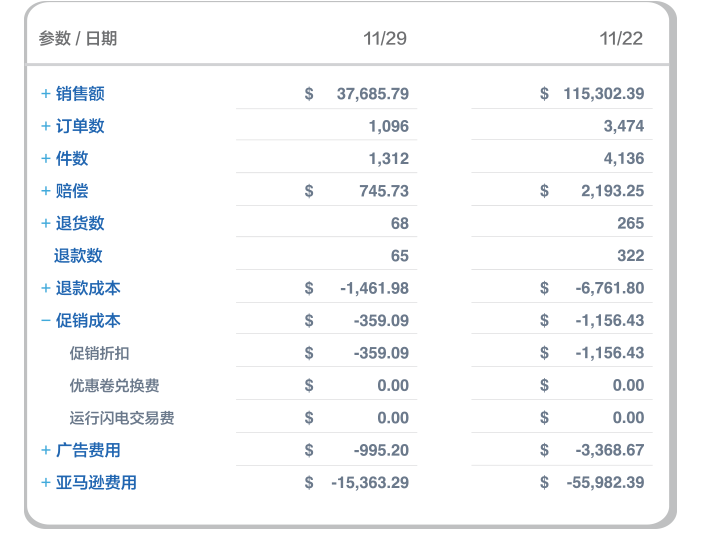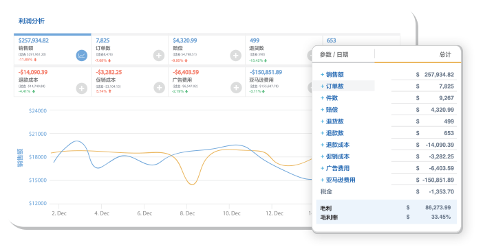 准确而完整的数据帮助卖家更快速判断您的店铺是否盈利。透过BQool的卖家酷利润报表,卖家可以了解相关的亚马逊销售和费用,更清楚了解店铺的销售表现。BQool进一步提供了精细的数据,拆分关键费用和成本,例如退款成本,促销成本,广告成本等。