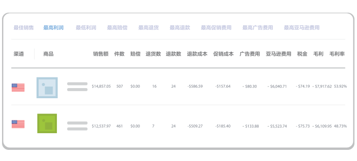 透过不同列表,识别追踪每个产品可能非常繁琐或非常困难,尤其是亚马逊相关的众多费用。透过BQool的多店铺利润看板,卖家方便查看与产品相关的销售、成本、利润,完整呈现在一个报表中。为了进一步简化报表,提供了排名列表,使卖家能够更快了解每个产品的利润。