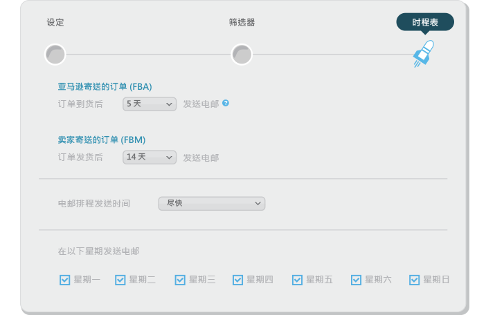 卖家酷提供亚马逊一键全自动索评,最安全的方式向买家邀评评论。不用担心主动发起邮件对话会被限制30天,也不需要下载软件登入到卖家后台造成卖家帐户关联的风险。您只需要在卖家酷里面一键设定完成,系统自动帮您发出符合亚马逊规定的官方模版。卖家酷多功能筛选器让您告别人工筛选,开启自动筛选更省时间。筛选器可以针对高质量ASIN发送邮件还可以排除有差评,取消跟退款的订单,搭配发送邮件时程表在对的时间发到买家信箱,不仅智能又高效,提升买家留评的几率。